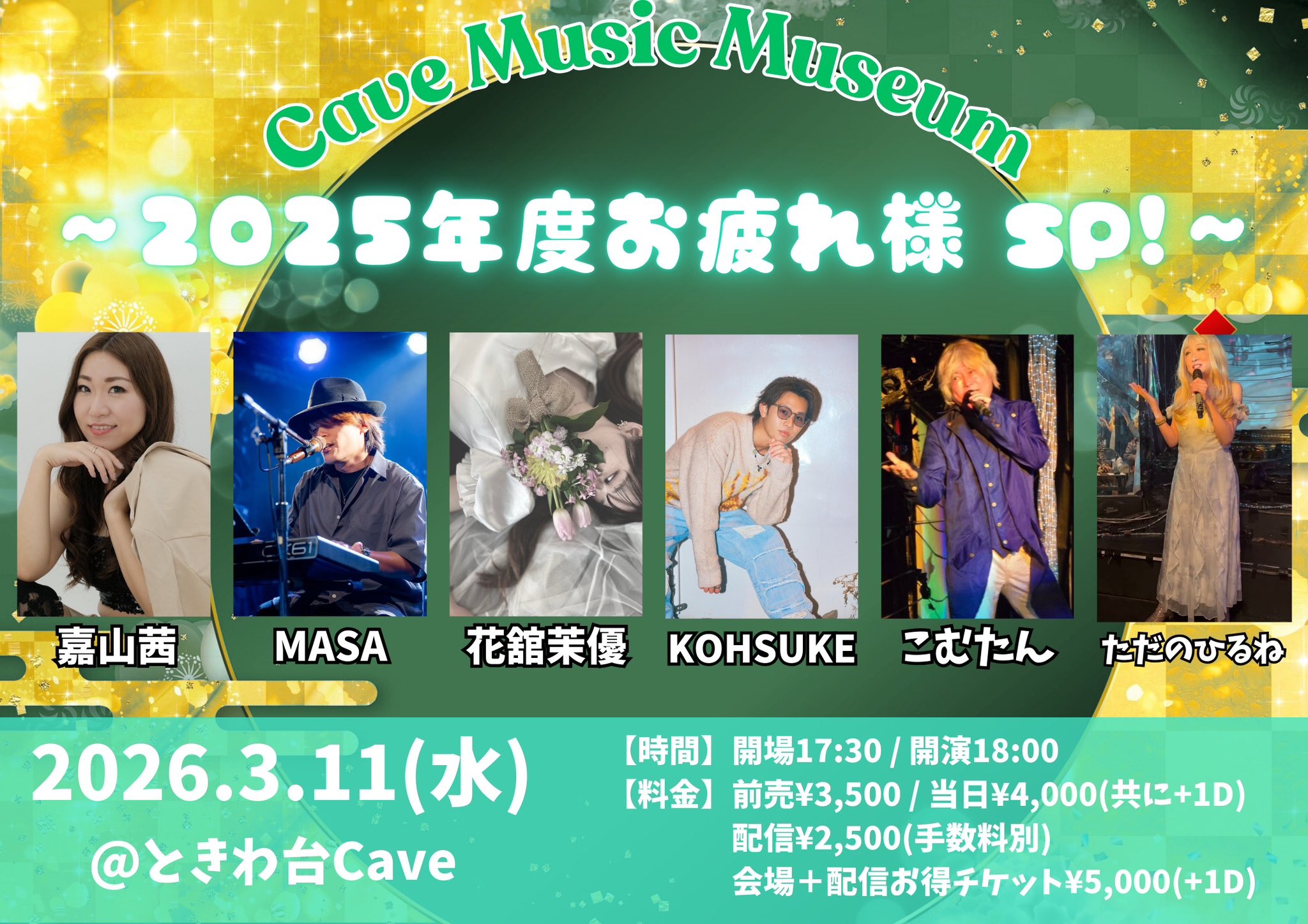 PLACE/ときわ台Cave OPEN17:30 START18:00 MC/前売り¥3,500 当日¥4,000(共に+1D) 配信¥2,500(手数料別) 会場+配信お得チケット¥5,000(+1D) 【会場チケット申し込み】 https://tiget.net/events/466853 【配信チケット申し込み】 https://premier.twitcasting.tv/c:cavetokiwadai/shopcart/420008