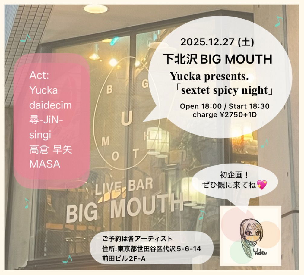 下北沢BIG MOUTH Yucka Pre「sextet spicy night」 OPEN 18:00 START 18:30 MC¥2,750+1D MASA出演時間は21:00~21:30