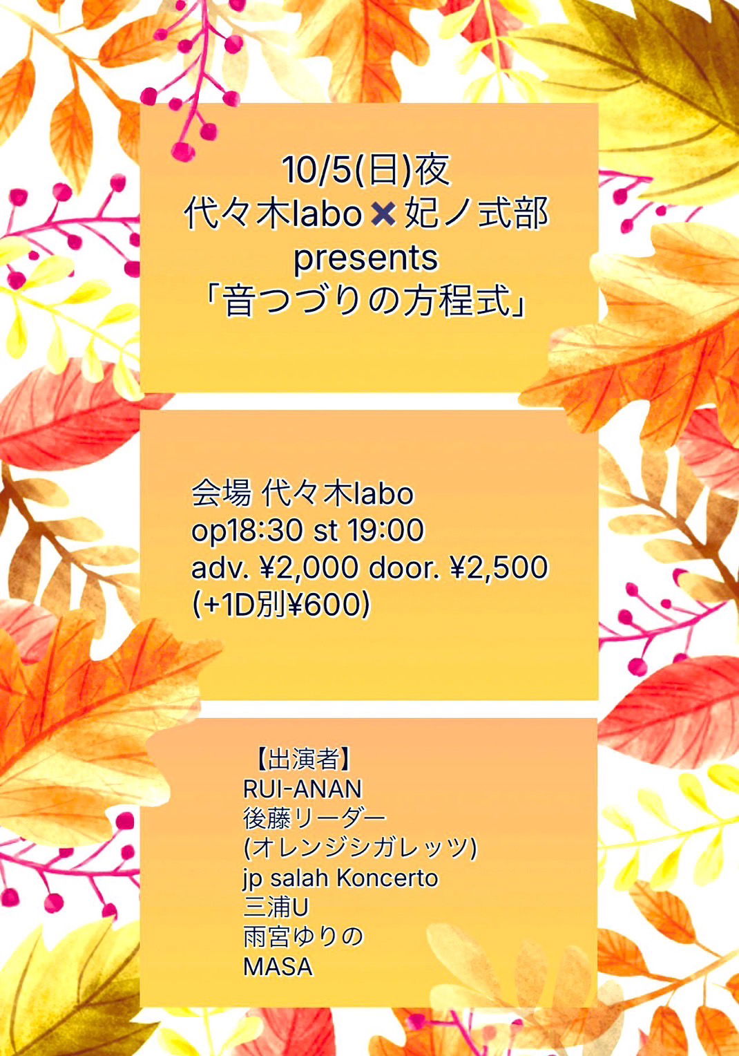 代々木labox妃ノ式部 presents「音つづりの方程式」 会場 / 代々木labo op18:30 / st 19:00 adv. ·2,000 door. $2,500 (+1D別¥600)