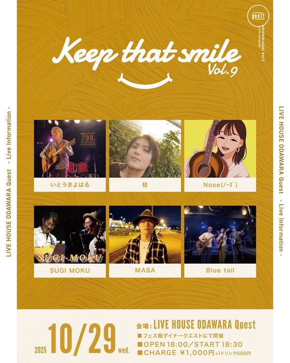 LIVE HOUSE ODAWARA Quest 「Keep that smile」 OPEN 18:00/START 18:30 ■CHARGE ¥1,000円+1ドリンク600円