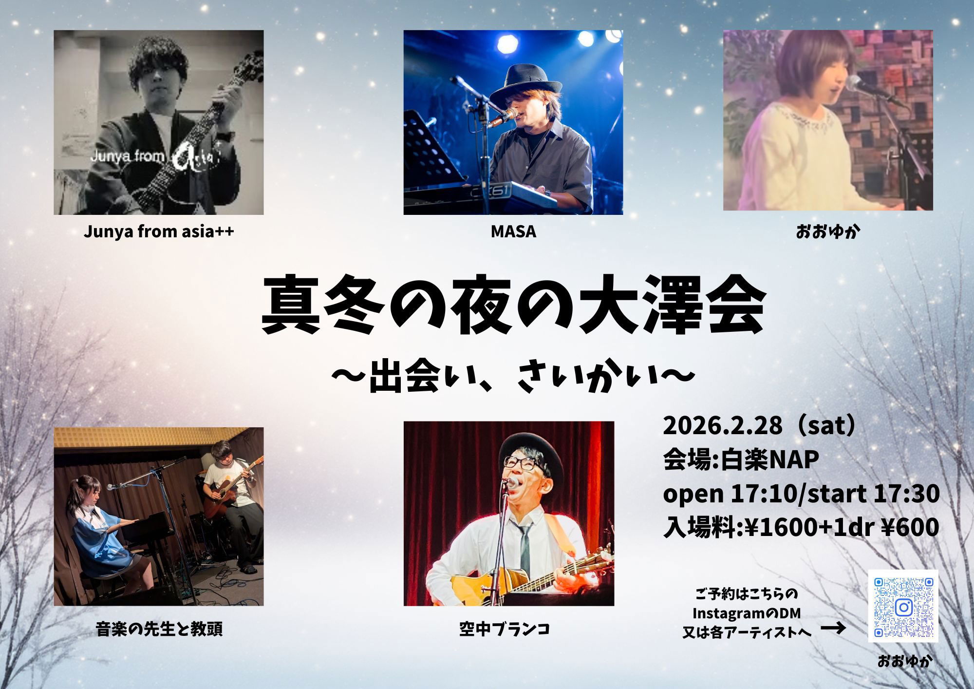 白楽NAP 真冬の夜の大澤会〜出会い、さいかい〜 open 17:10 start 17:30 charge ¥1600+1d(¥600)