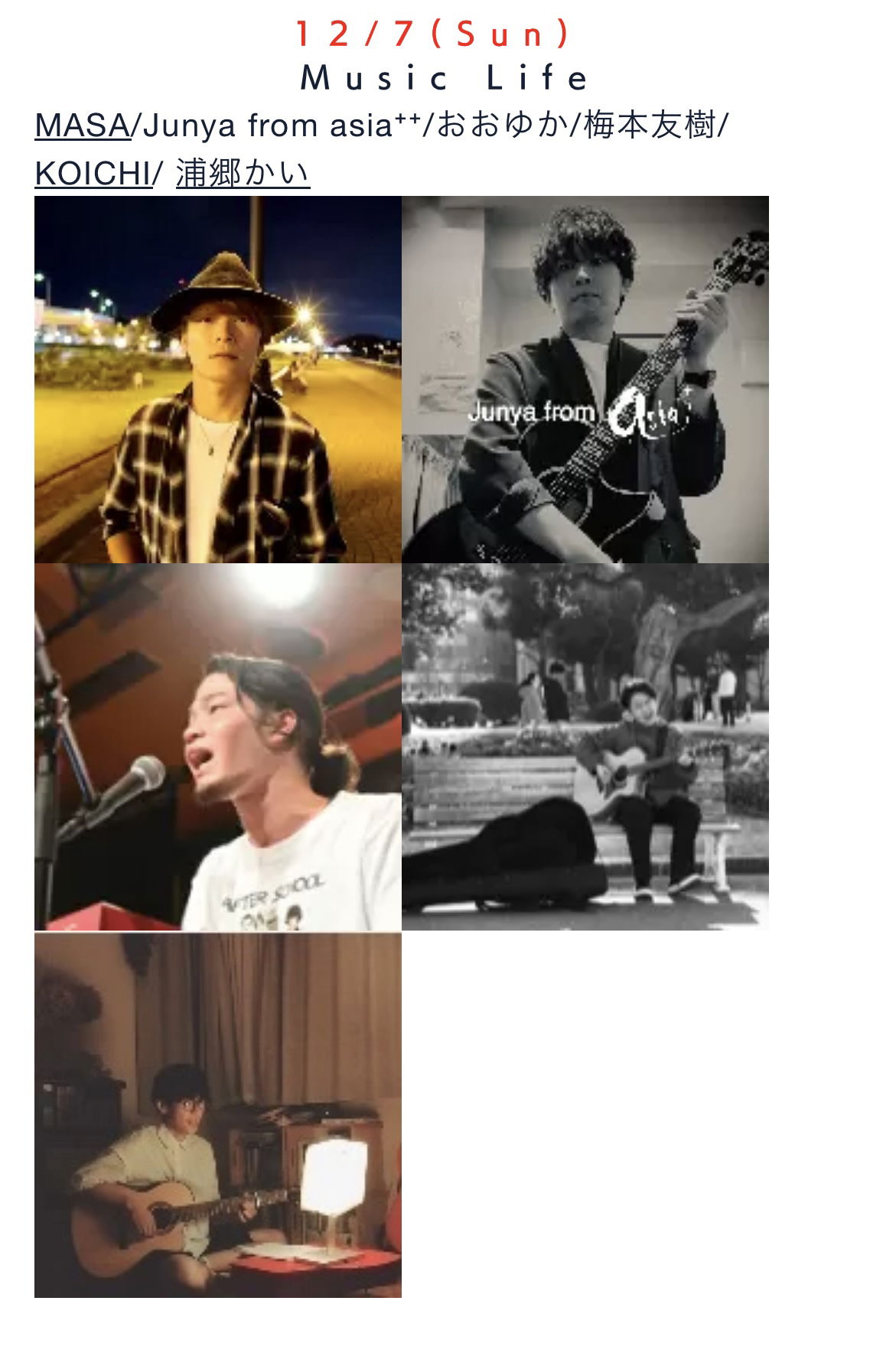 2025年12/7(日)「Music Life」 ・会場:白楽Nap ・OP/ST 17:10/17:30 ・入場料:¥1.600+1dr¥600 (出演順) 1.MASA(17:30-18:00) 2.おおゆか(18:05–18:35) 3.梅本友樹(18:40-19:10) 4.KOICHI(19:15-19:45) 5.浦郷かい(19:50-20:20) 6.Junya from asia⁺⁺(20:25-20:55)