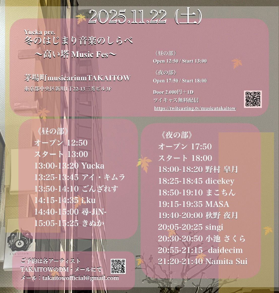 茅場町TAKAITOW Yucka pre. 冬のはじまり音楽のしらべ ~高い塔 Music Fes〜 (夜の部) PLACE/茅場町TAKAITOW OPEN/17:50 START/18:00(MASA出演時間19:15〜19:35) Door ¥2,000 +1D