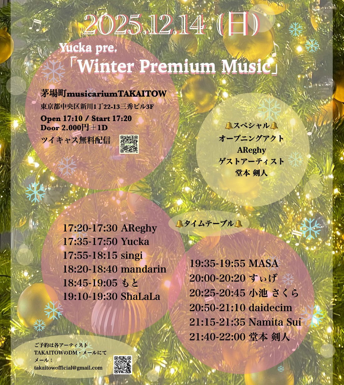 茅場町TAKAITOW Yucka pre. 「Winter Premium Music」 OPEN 17:10 START 17:20 MC/¥2000+1D MASA出演時間は19:35~19:55