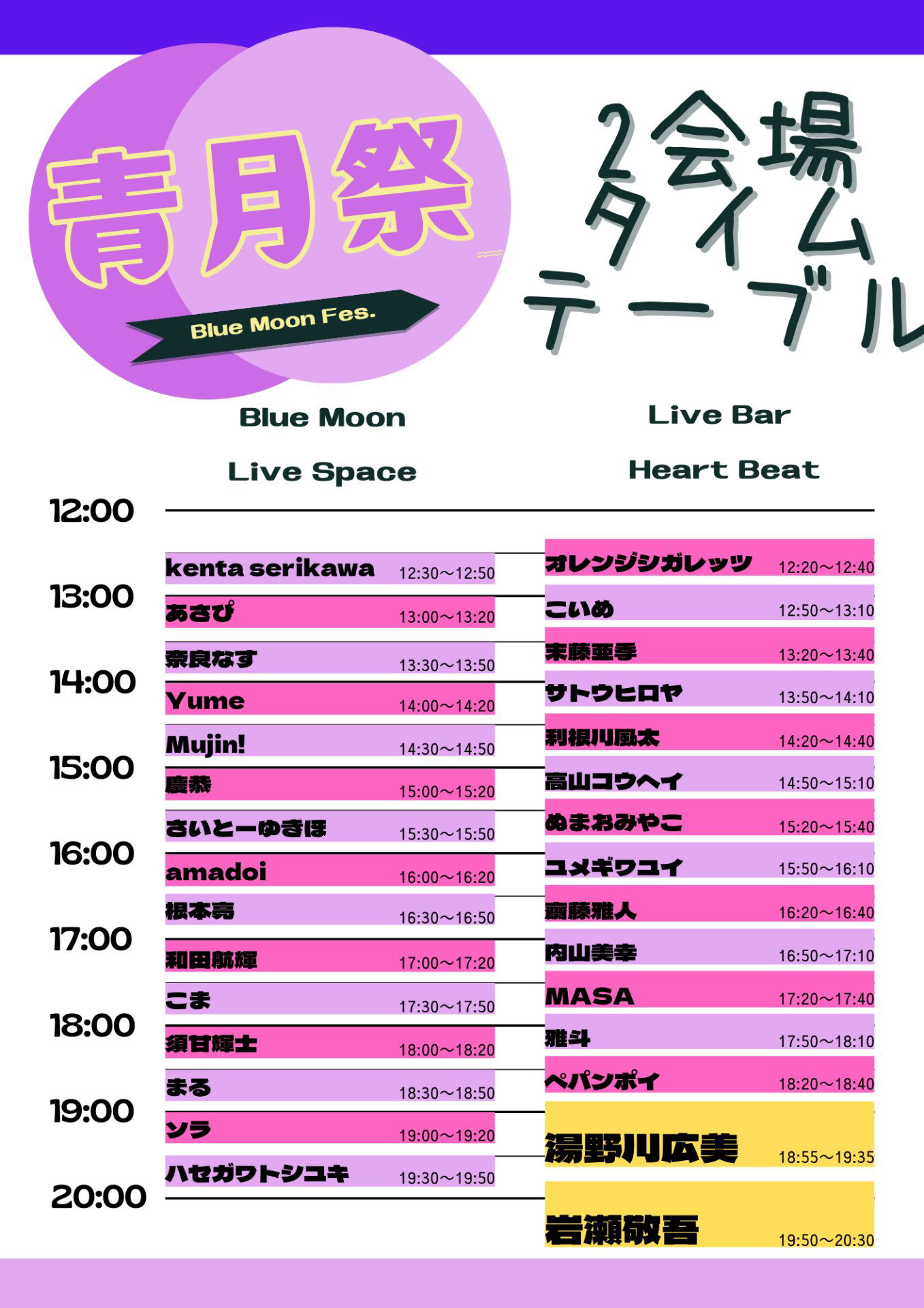青月祭 -Blue Moon Fes. 会場 立川Heat Beat OPEN 12:00/ START 12:20 前売り3000円+1d700円 当日3500円+1d700円 MASA出演時間は17:20〜17:40