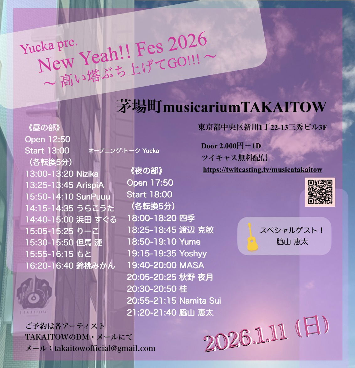 Yucka pre. New Yeah!! Fes 2026 〜高い塔ぶち上げてGO!!!〜 《夜の部》 Open 17:50 Start 18:00 Door 2.000円 + 1D MASA出演時間は夜の部(19:40〜20:00)